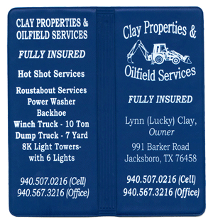 Stock Vinyl Cover Colors: Black, White, Royal Blue, Navy Blue, Green, Burgundy and Red — all with clear inside pockets. Custom colors are available on quantities of 1,000 or more.